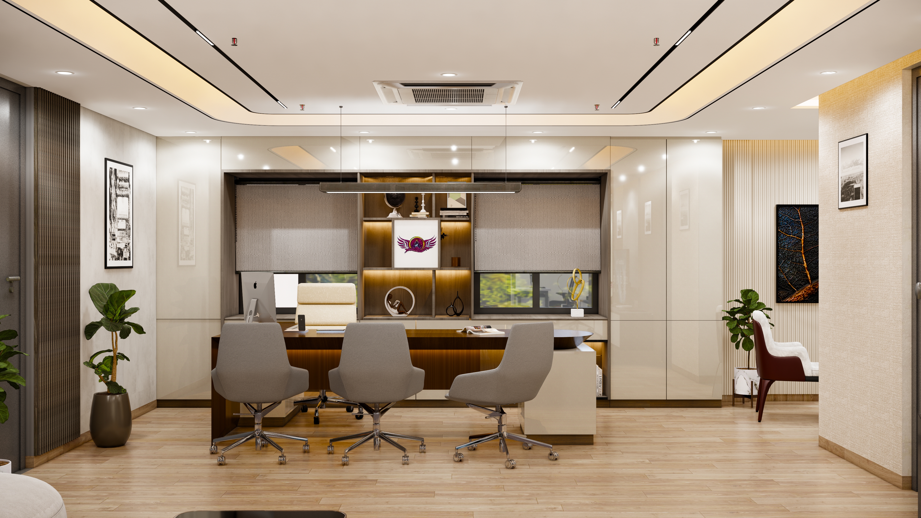 The director’s cabin embodies understated opulence, featuring a soothing palette, soft lighting, and refined finishes that evoke a sense of authority balanced with tranquility. Meanwhile, the main workspace embraces openness and energy, integrating ergonomic layouts and vibrant accents that foster teamwork and innovation.